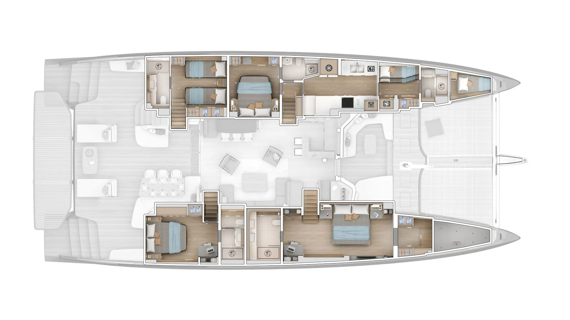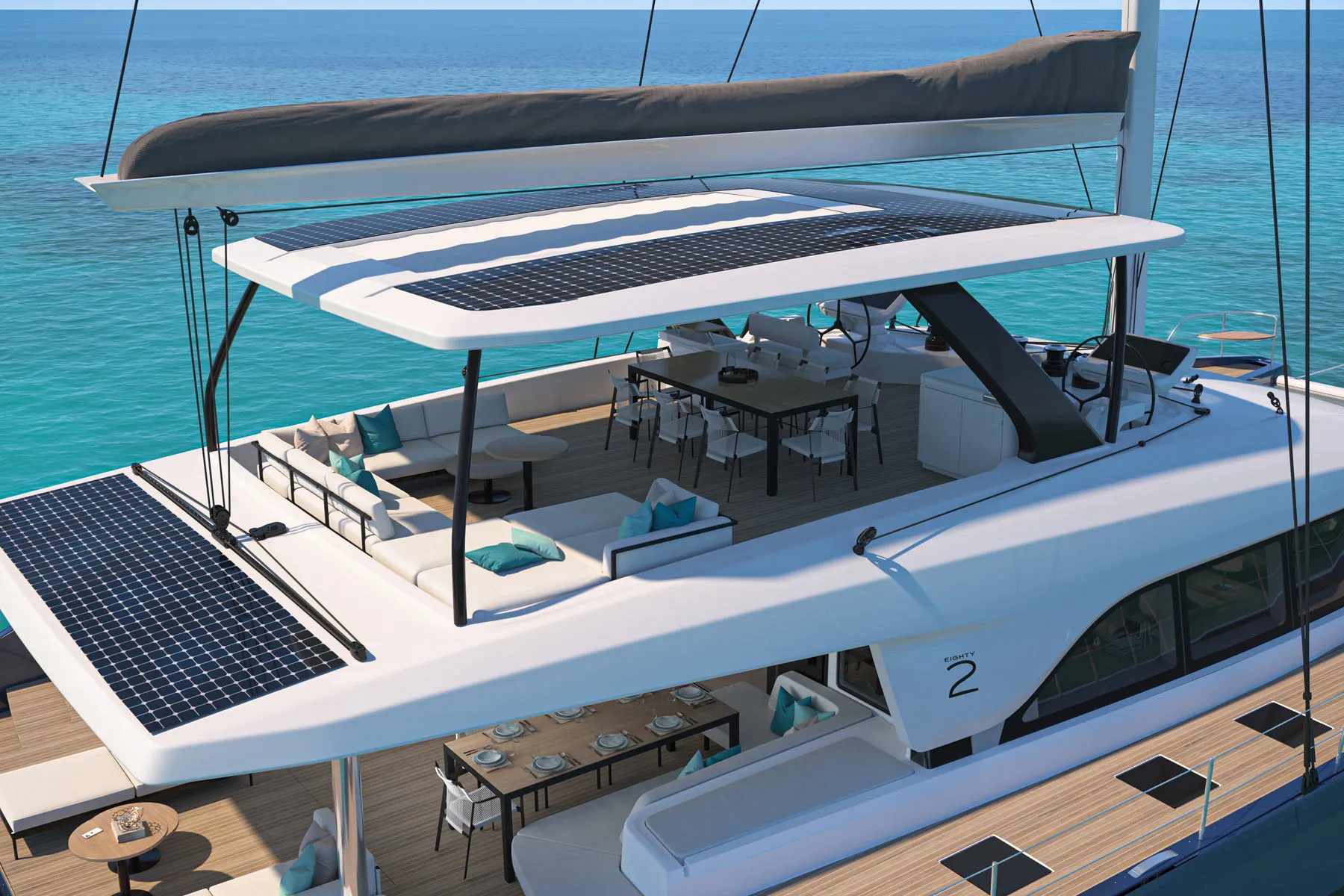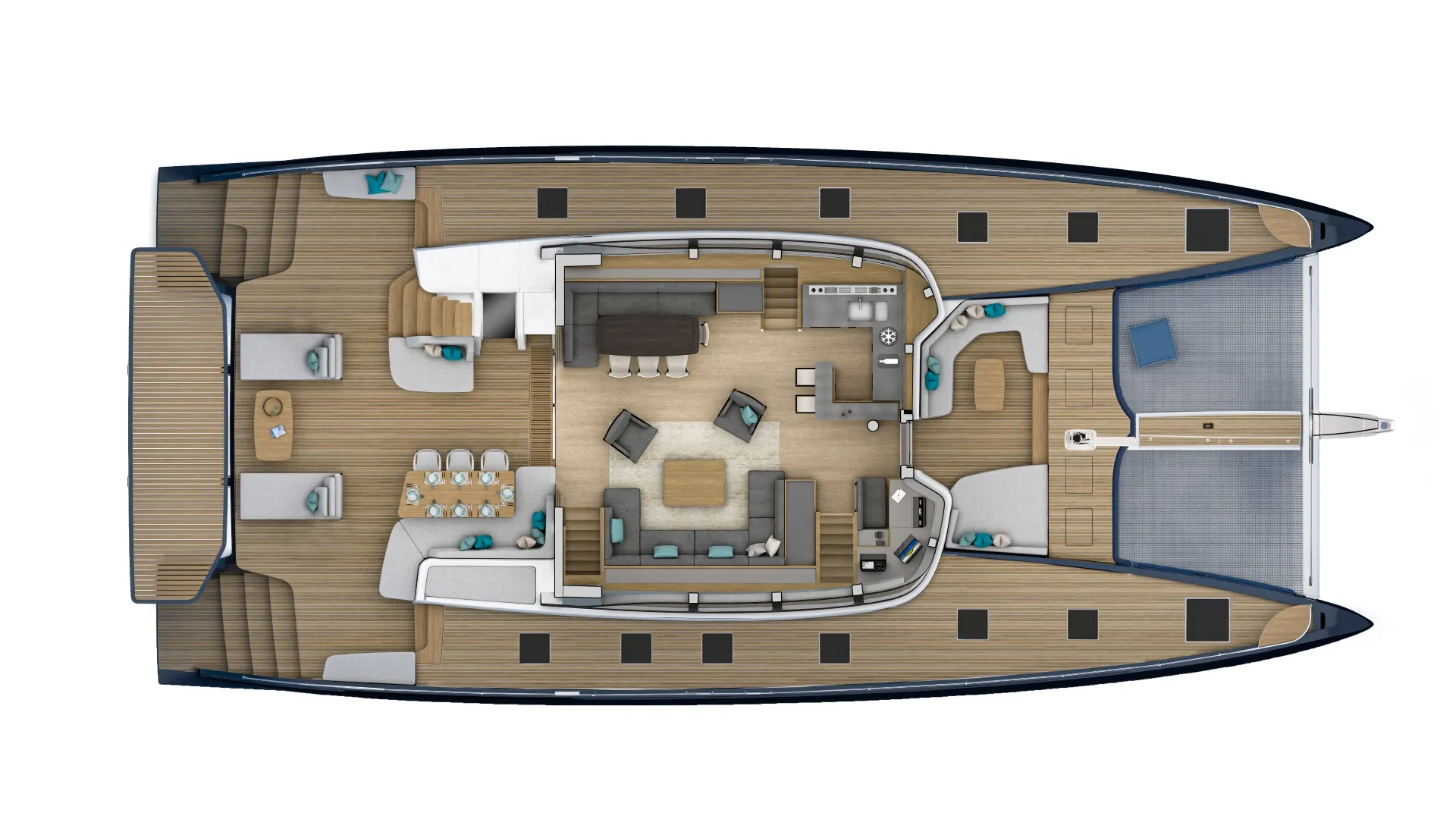 내부에서는 플러시 바닥재가 설치된 객실이 카타마란 내부의 이동을 용이하게 합니다. 생활 공간은 자연스럽게, 완전한 자유 속에서 선상 생활을 경험할 수 있도록 설계되었습니다. 외부를 향해 설계된 EIGHTY 2는 해변 빌라의 디자인 코드를 특징으로 하며, 수평선을 감상할 수 있는 360° 전망을 제공합니다.