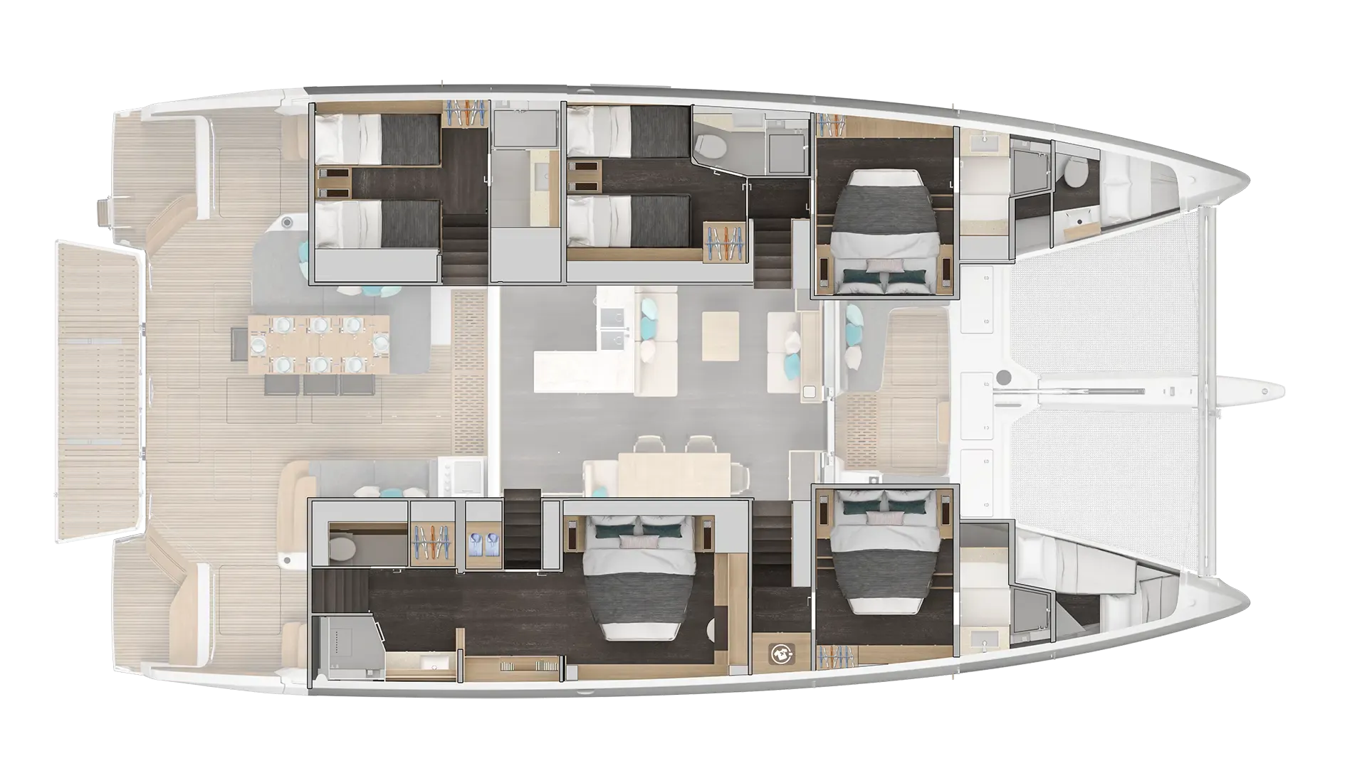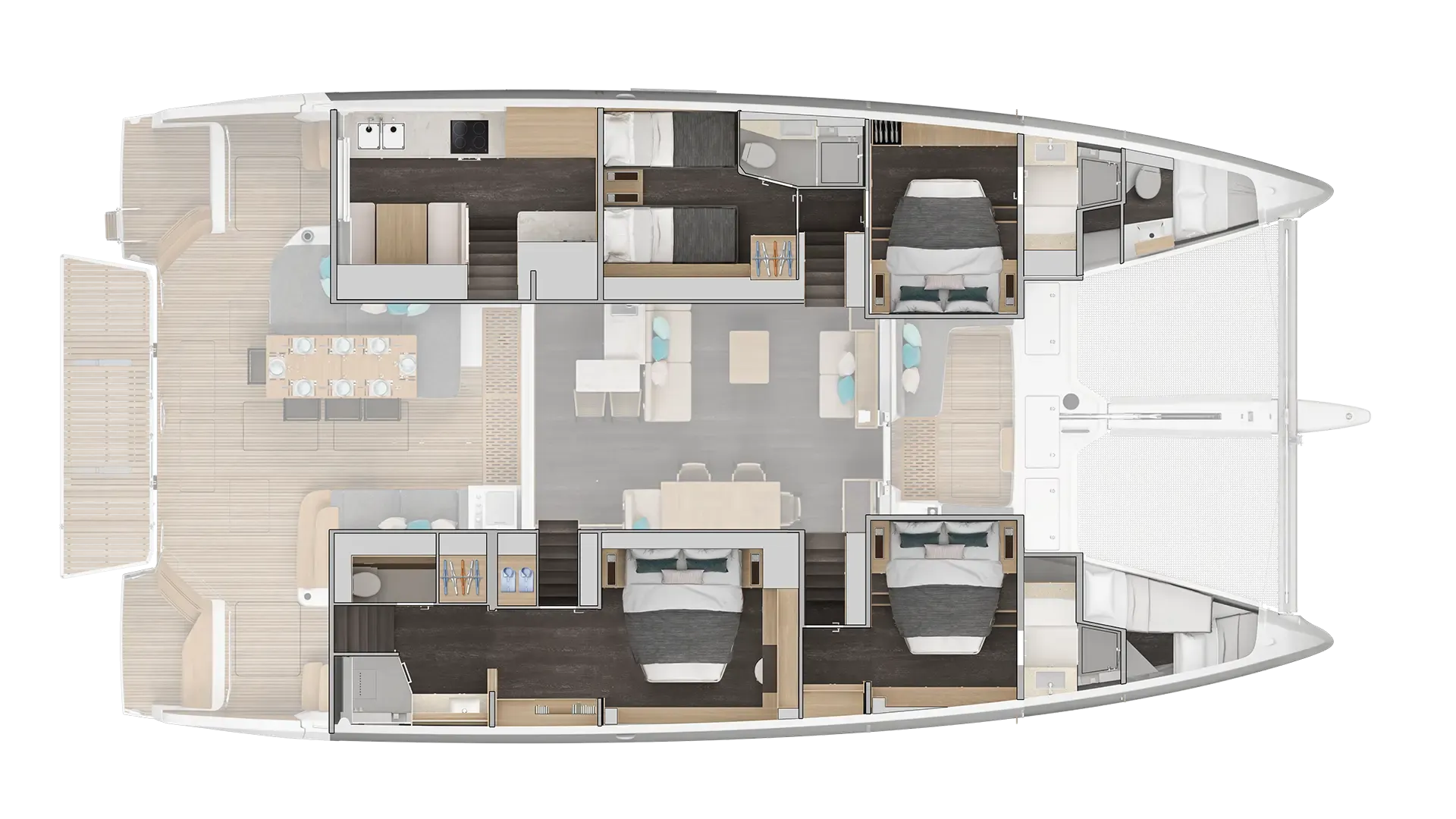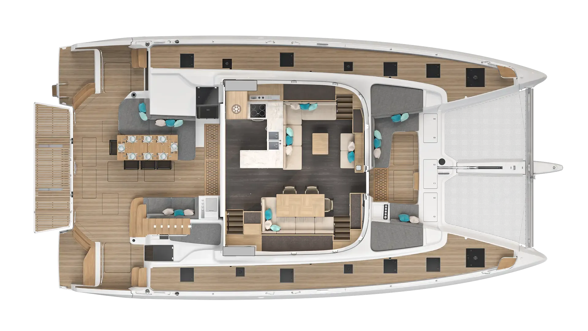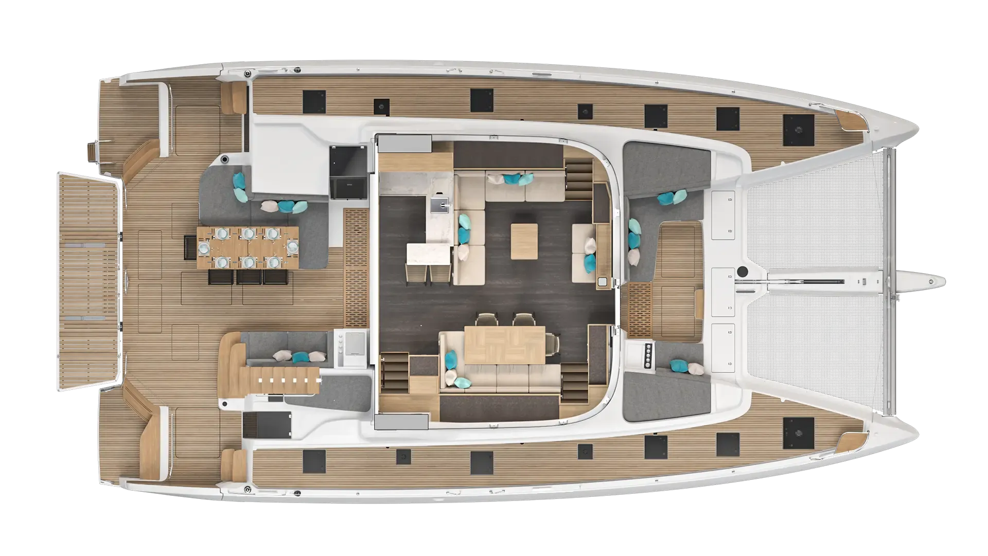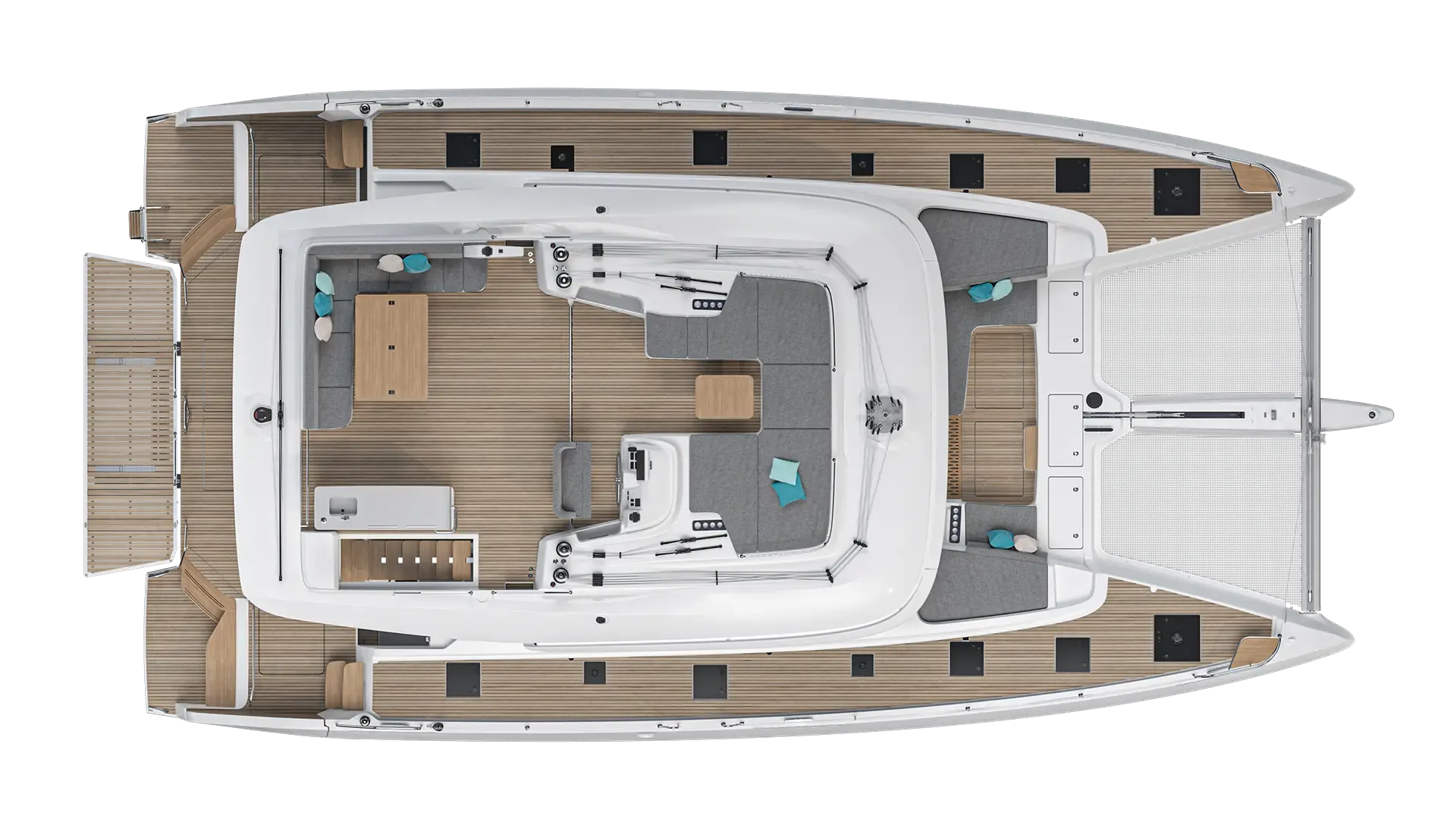 선실 앞쪽의 문을 통해 접근하고, 평평한 바닥을 갖춘 넓은 전방 코크핏은 편안하고 초대하는 휴식 공간을 제공합니다. 각 생활 공간에 들어서면 파노라마 전망이 여러분을 맞이합니다. 쌍동선 내부의 이동은 장애물 없이 유려하게 이루어집니다.