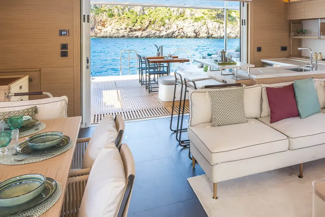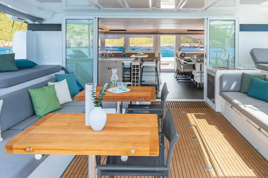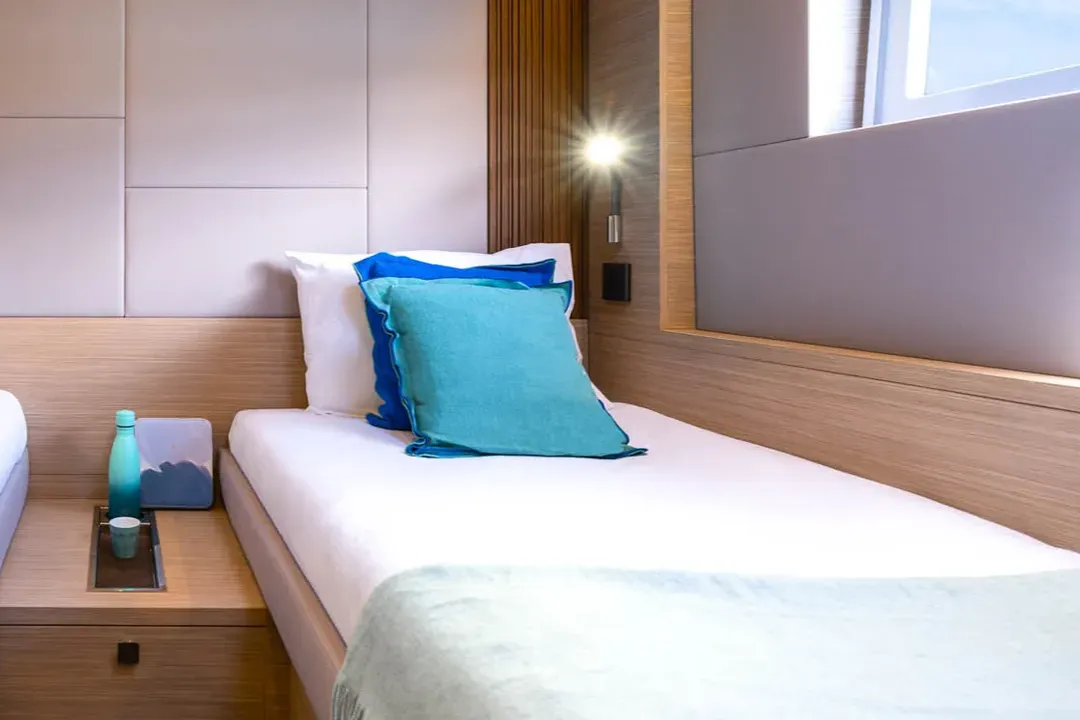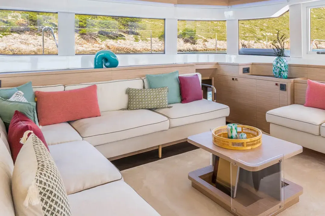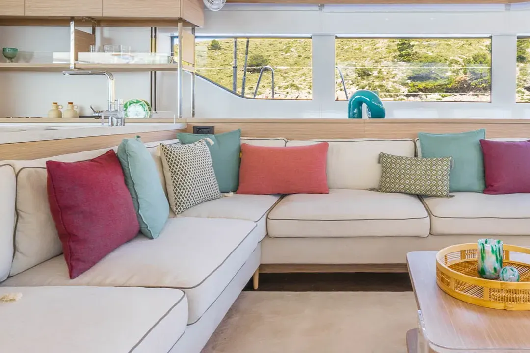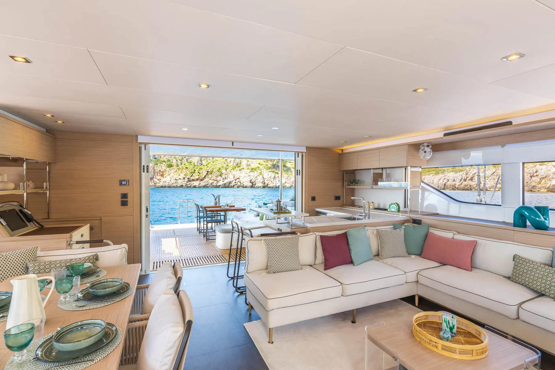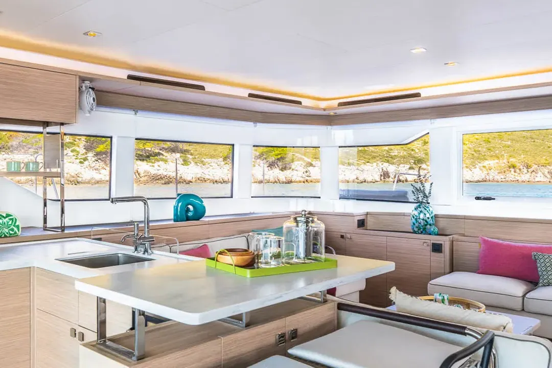 선실 앞쪽의 문을 통해 접근하고, 평평한 바닥을 갖춘 넓은 전방 코크핏은 편안하고 초대하는 휴식 공간을 제공합니다. 각 생활 공간에 들어서면 파노라마 전망이 여러분을 맞이합니다. 쌍동선 내부의 이동은 장애물 없이 유려하게 이루어집니다.