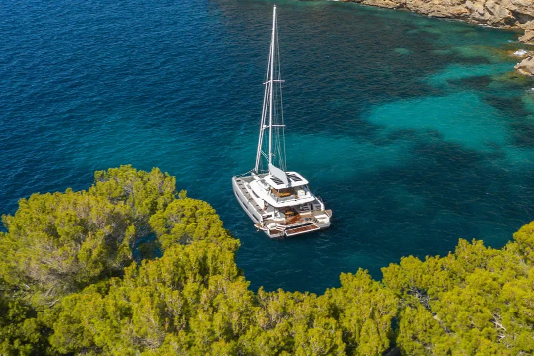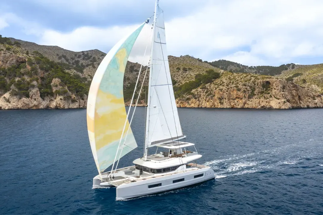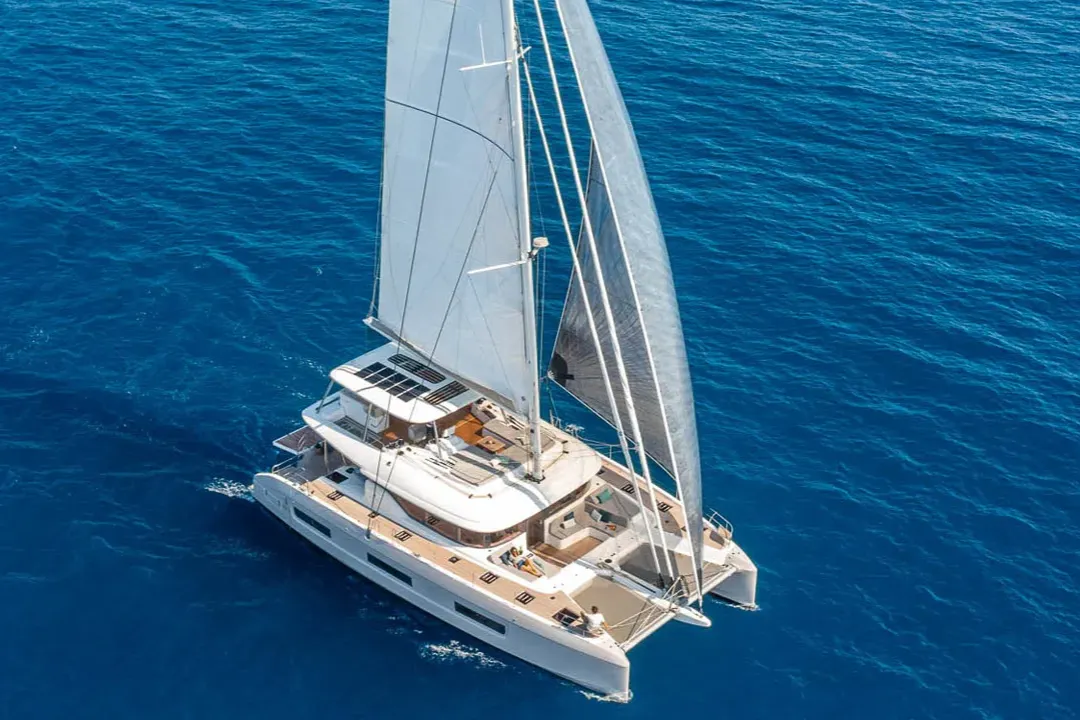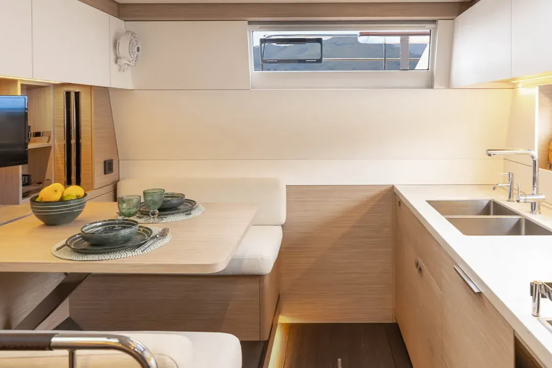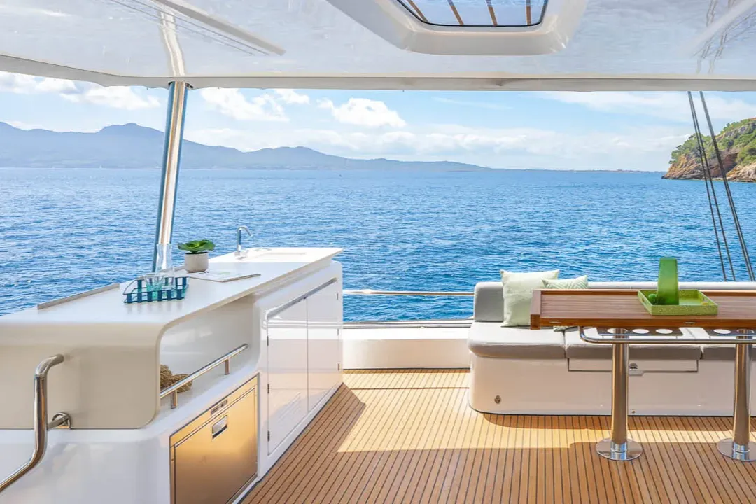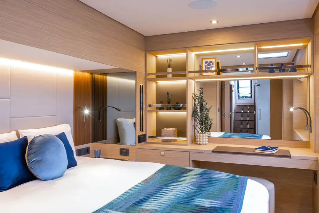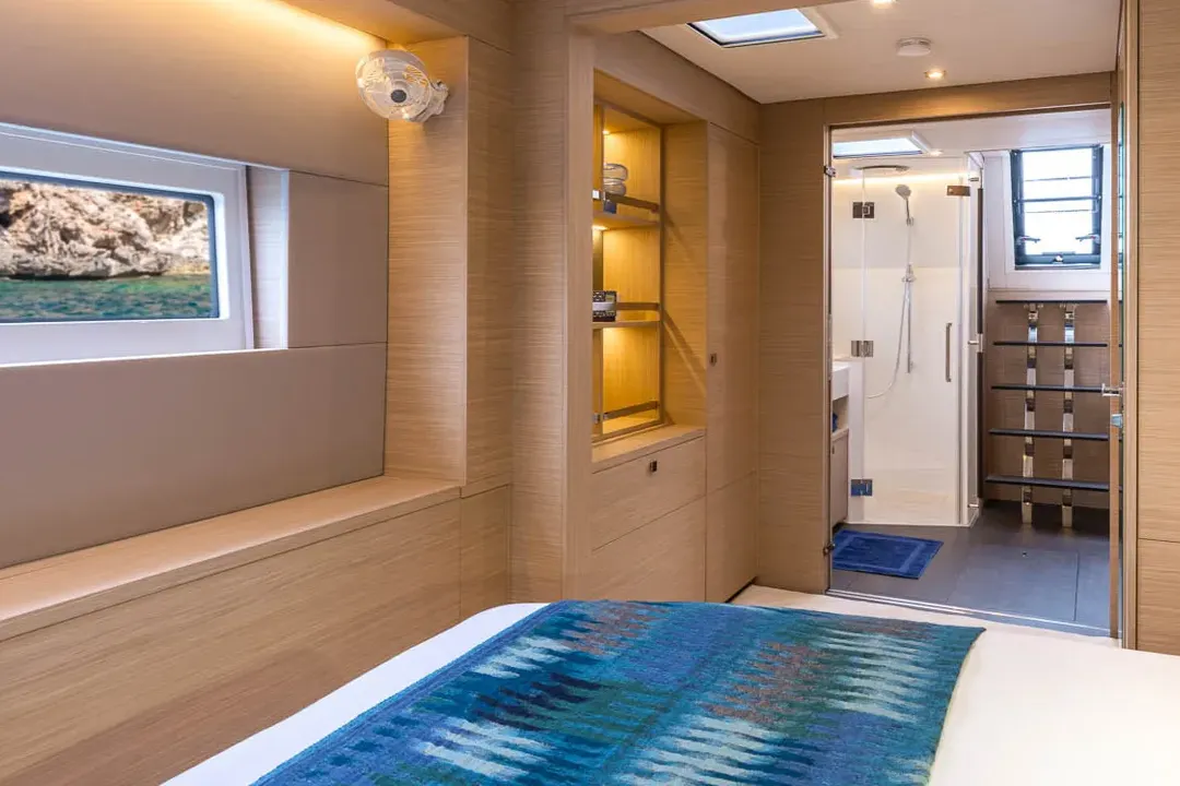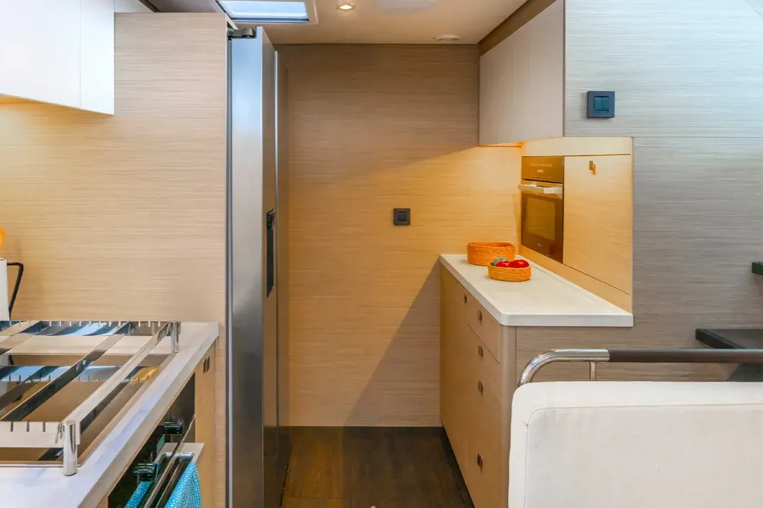 선실 앞쪽의 문을 통해 접근하고, 평평한 바닥을 갖춘 넓은 전방 코크핏은 편안하고 초대하는 휴식 공간을 제공합니다. 각 생활 공간에 들어서면 파노라마 전망이 여러분을 맞이합니다. 쌍동선 내부의 이동은 장애물 없이 유려하게 이루어집니다.