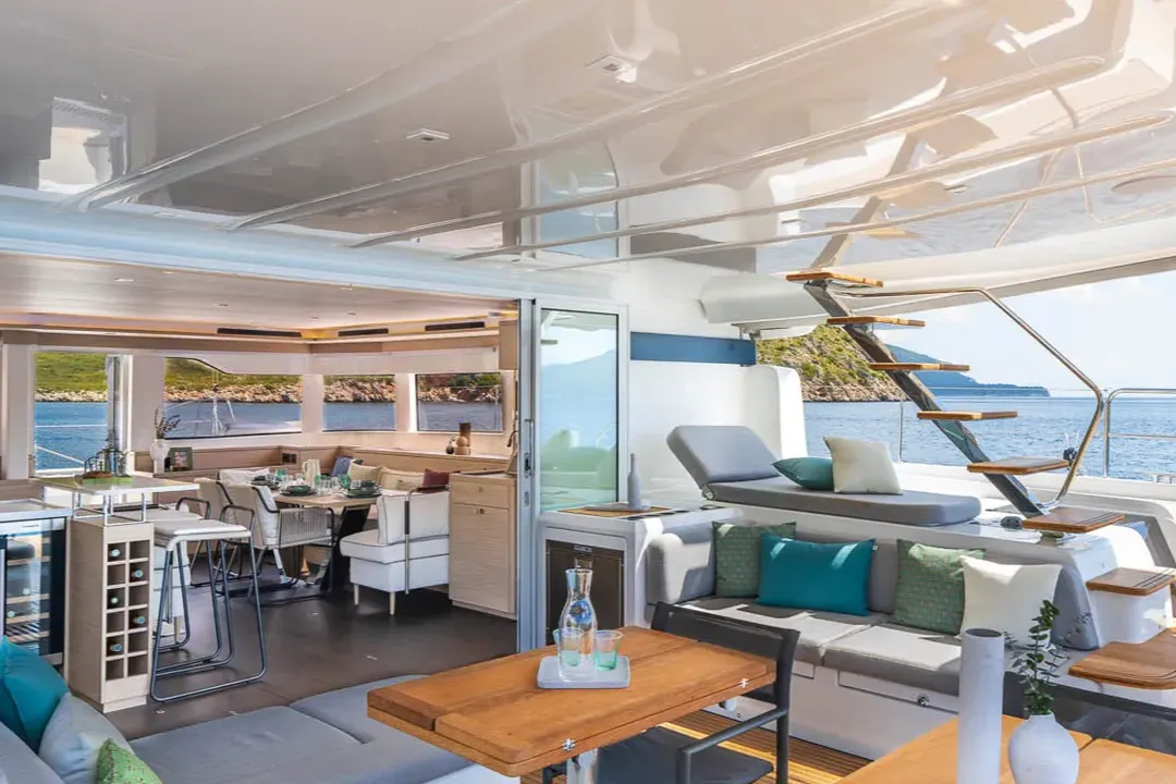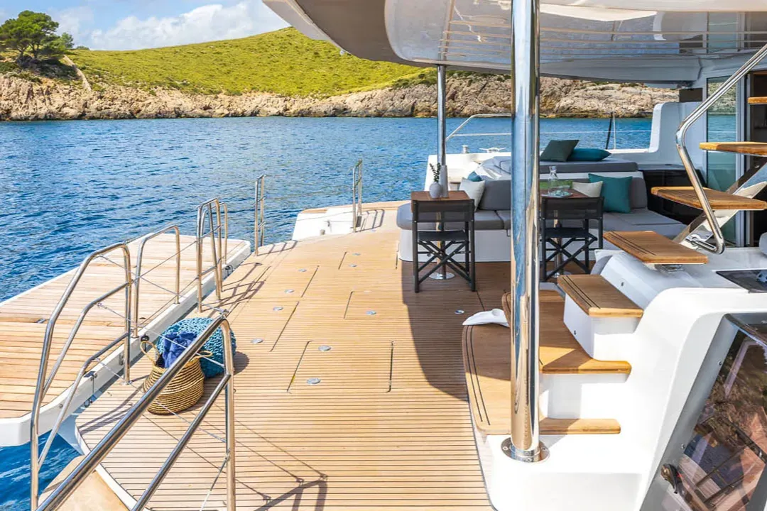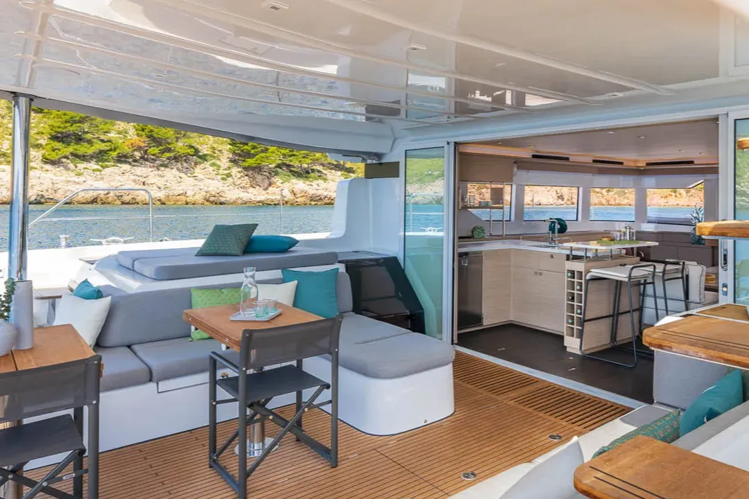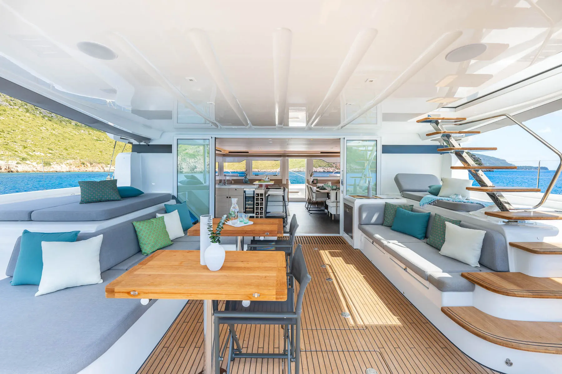 바다에 완전히 열려 있는 라군 60의 선미 코크핏은 탁월한 이동의 자유를 제공합니다. 개방형 테라스는 수영을 위한 즉각적인 접근을 가능하게 합니다. 여러분의 가장 좋아하는 생활 공간이 되도록 설계된 선미 코크핏은 완만한 각도의 계단을 통한 안전하고 쉬운 접근성의 이점을 제공합니다.