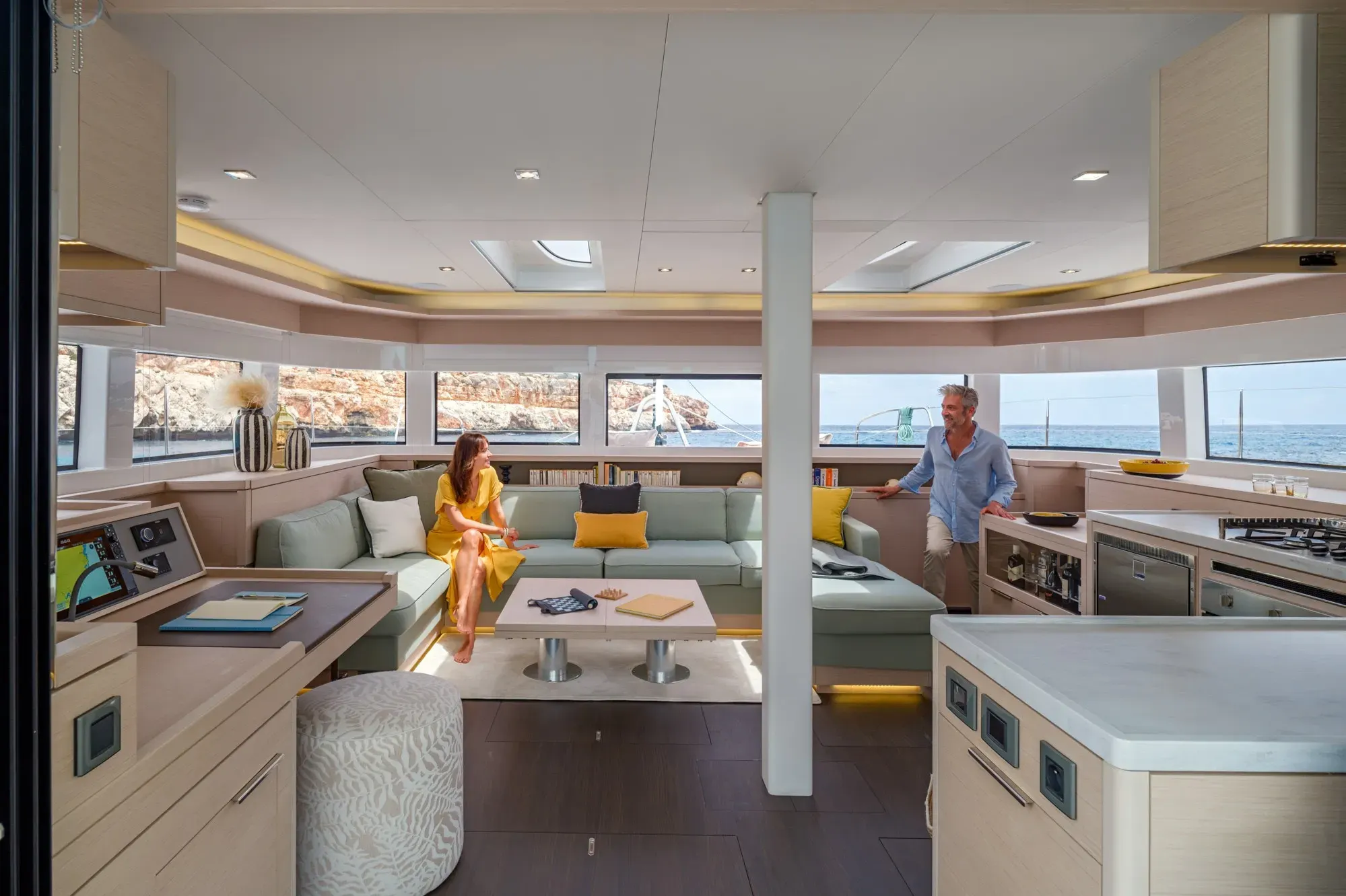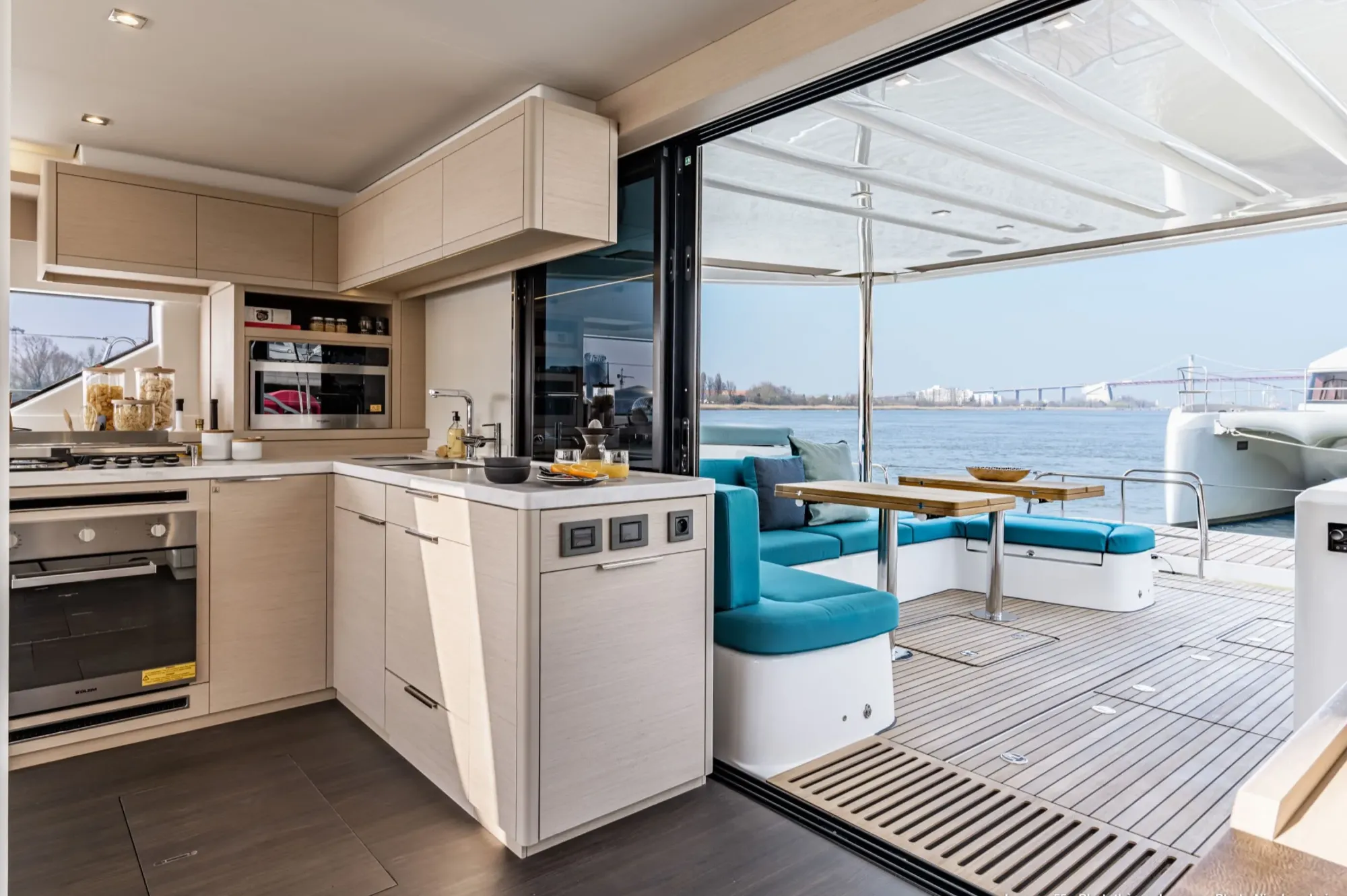 넓은 중앙 주방과 함께 재설계된 콕핏과 플라이브릿지를 발견해보세요. 이는 승선한 모든 이들에게 실용성과 즐거운 삶의 질을 제공합니다.