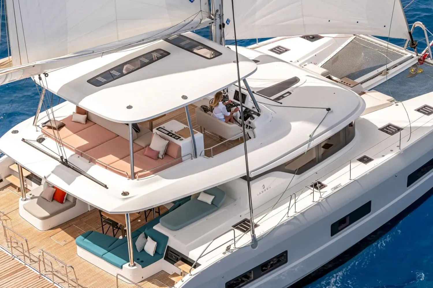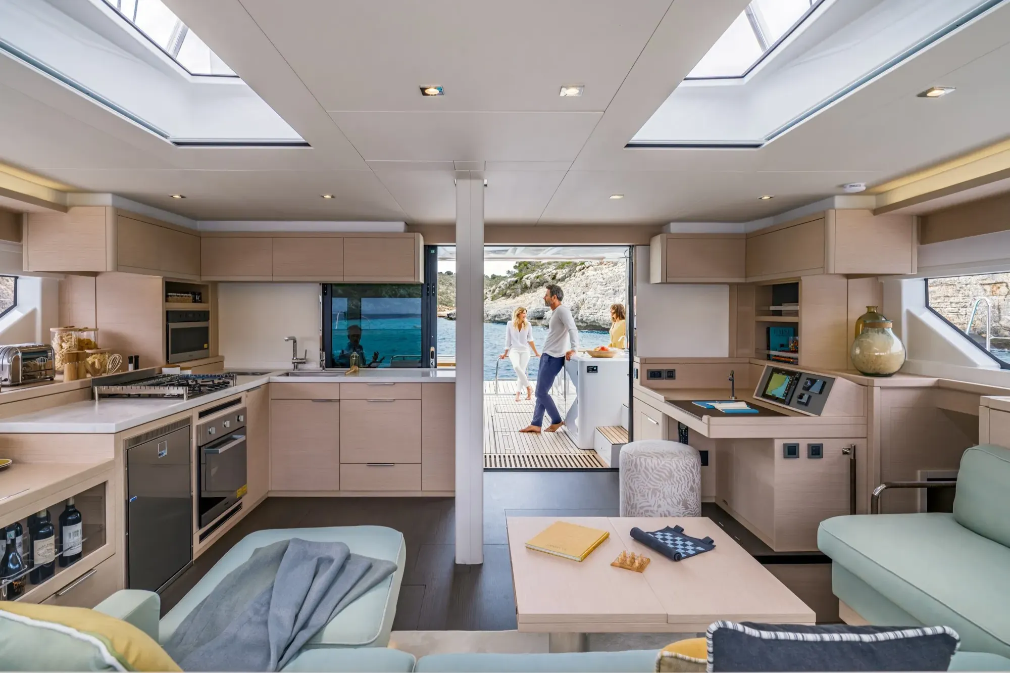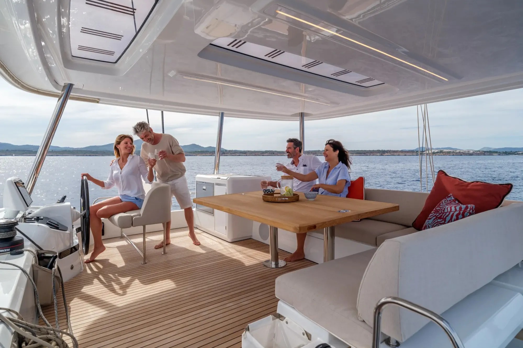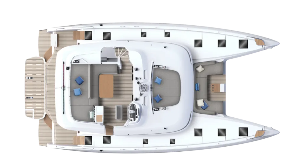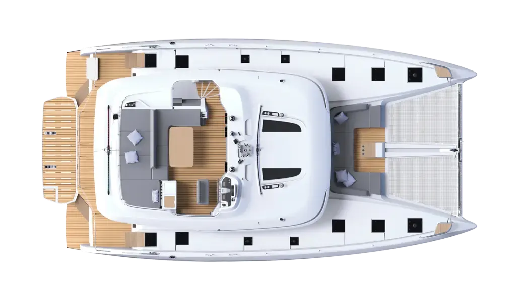 물 위의 진정한 테라스로 설계된 라군 55의 선미 콕핏은 바다의 비교할 수 없는 전망을 제공합니다. 새로운 건축 디자인 솔루션을 통해 선미 트랜섬의 공간을 재배치하여 선상에서의 움직임과 생활의 흐름을 새롭게 재창조했습니다.
