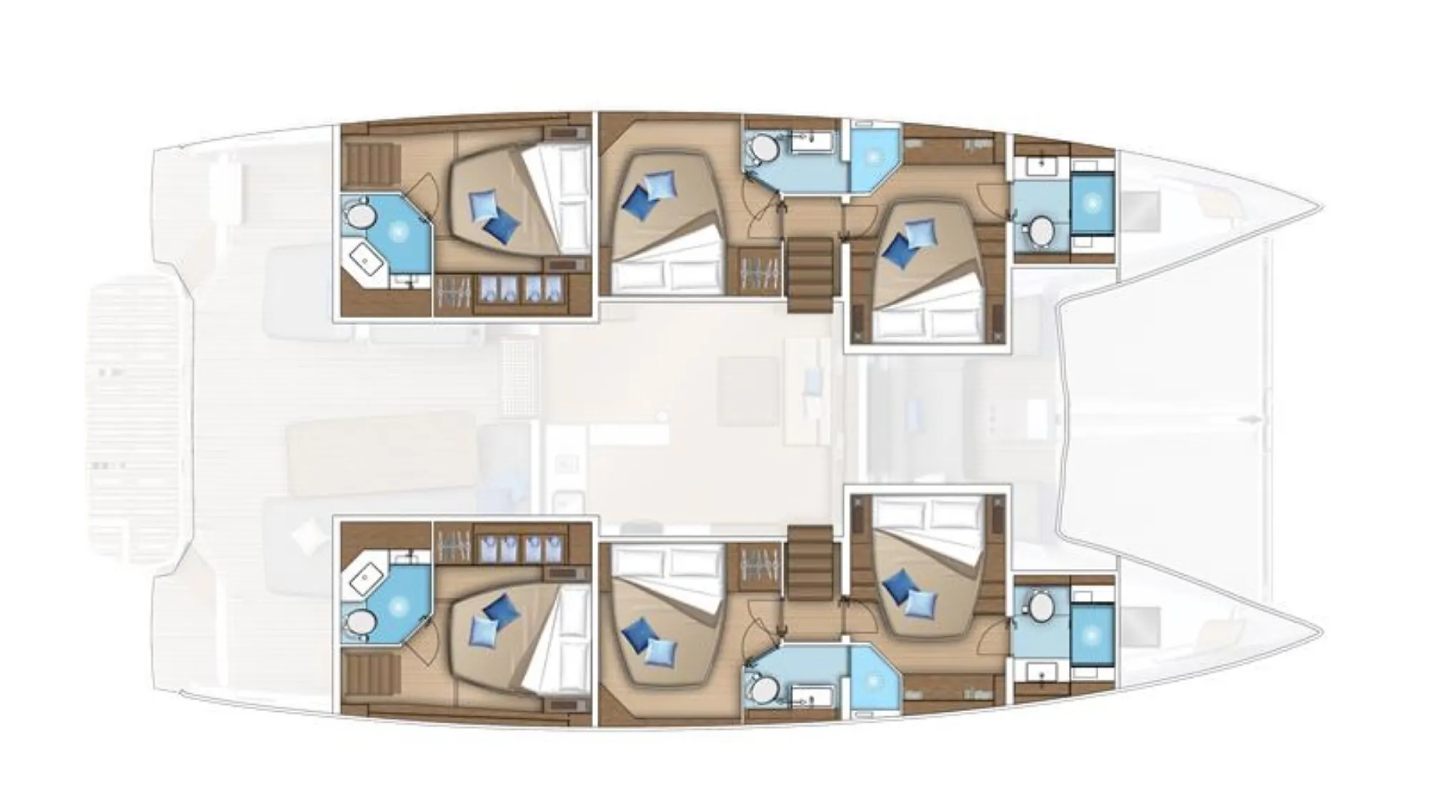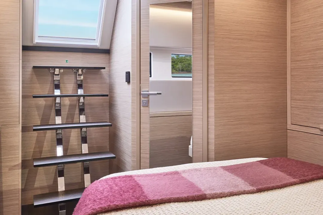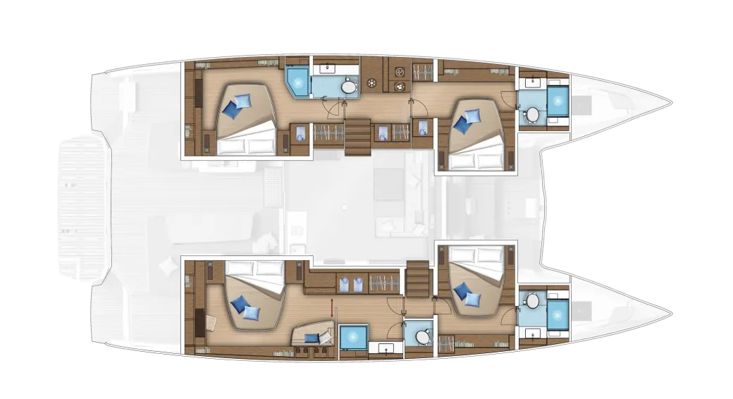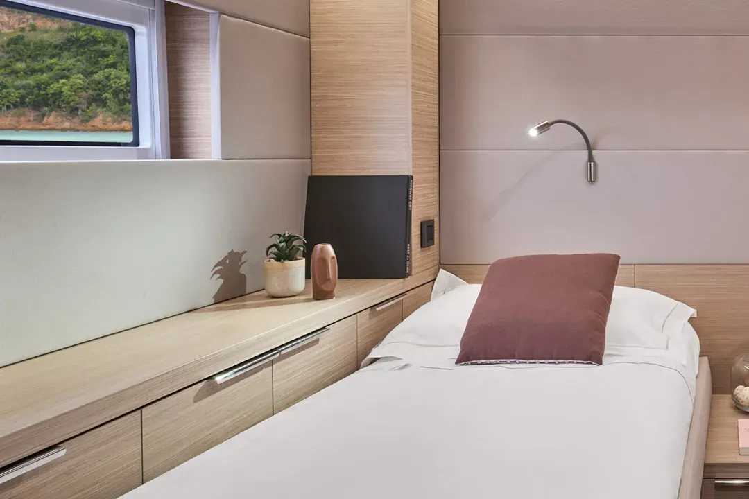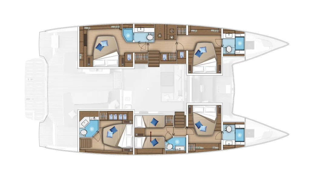 Opt for a catamaran boasting six cabins of equal size and with identical features. This catamaran is perfectly designed for charter use and activities. She can accommodate up to twelve people on board in optimal comfort.