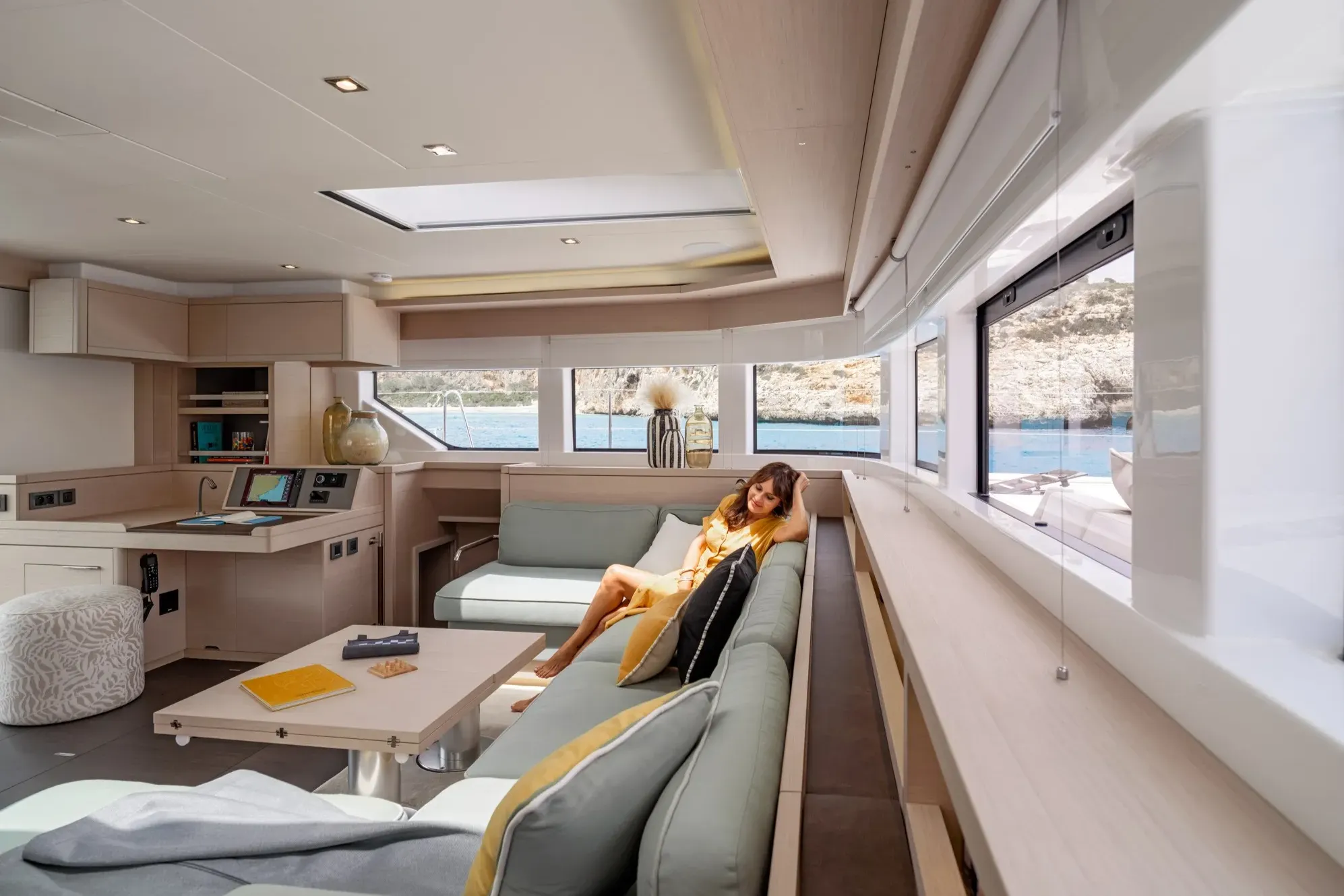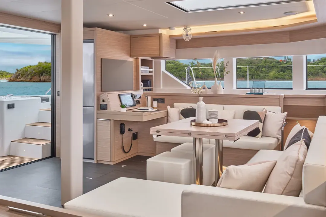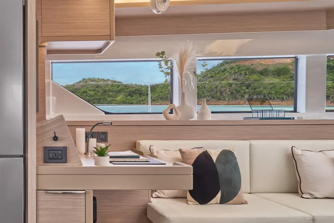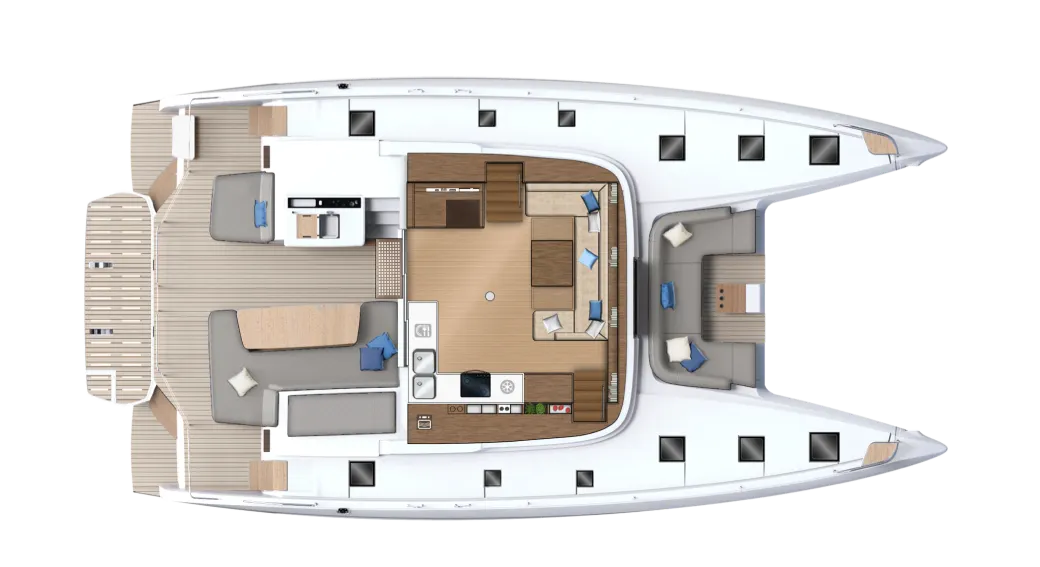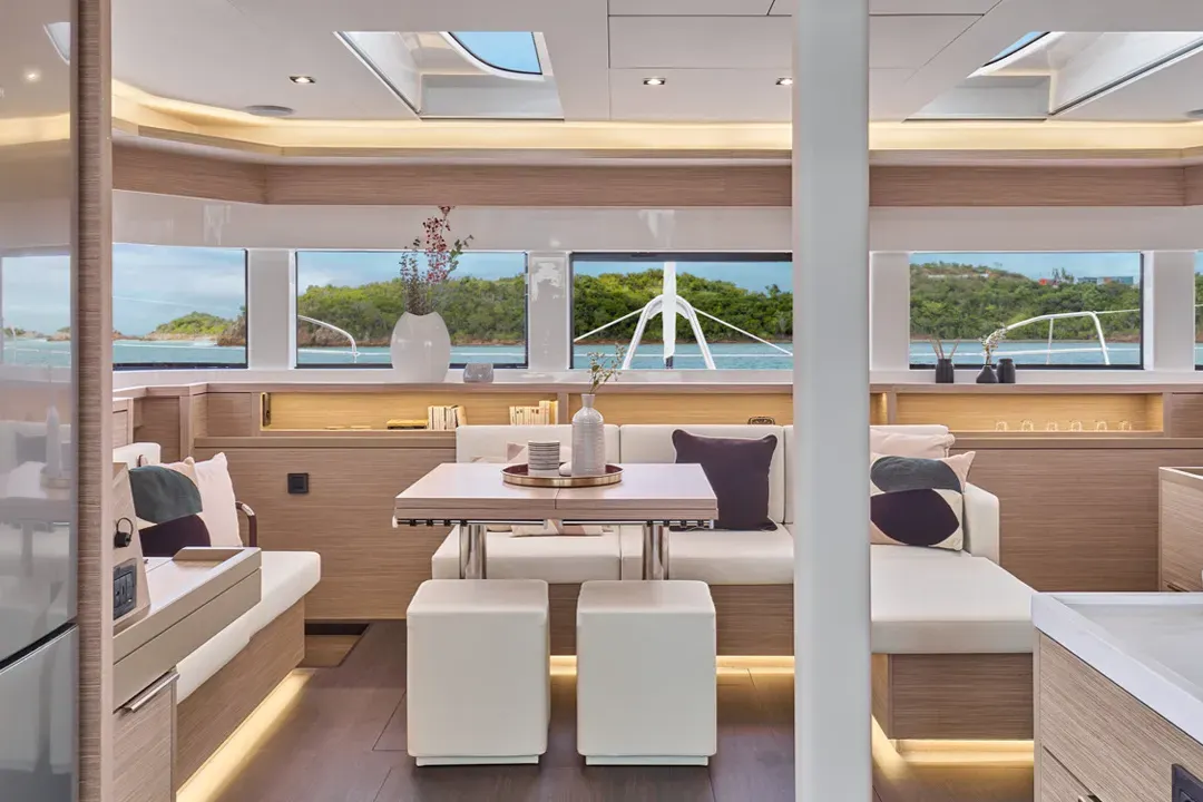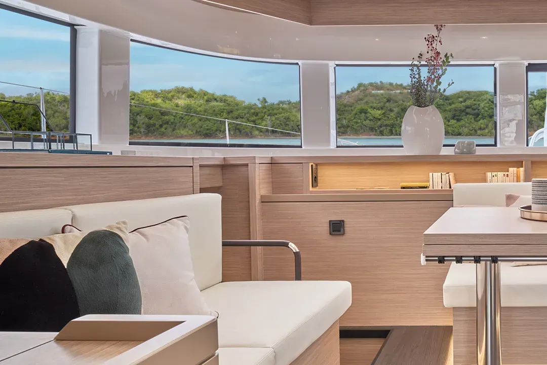 라군 요트에서 직접 영감을 받아 특별한 선상 생활의 질을 제공하는 이 요트의 내부는 바다, 하늘, 햇살, 그리고 주변 환경의 아름다움을 최대한 활용할 수 있게 해줍니다: 라군 55가 성공적으로 달성한 디자인적 도전입니다.