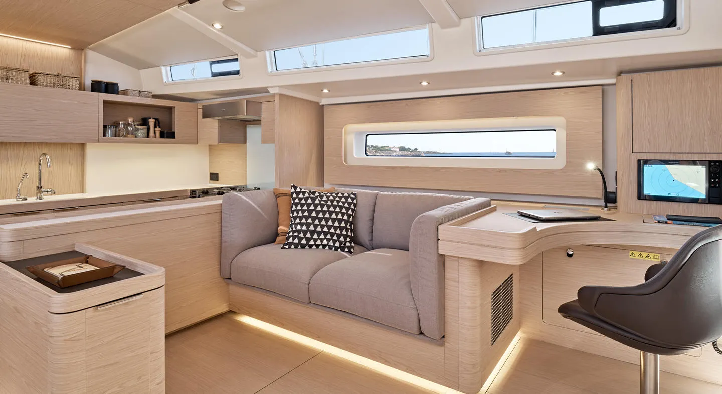 The large saloon where six people can seat around the table facing the relaxation area with its soft sofa. The curved chart table allows the navigator to participate in all the discussions on board. Available in a 3-cabin version with 3 heads, the Oceanis Yacht 60 comes with two different finishes: walnut as standard and light oak on option. Many moulded wood features blend harmoniously with large lacquered white surfaces and are matched with exclusive upholstery. Together they create a distinctly stylish atmosphere.