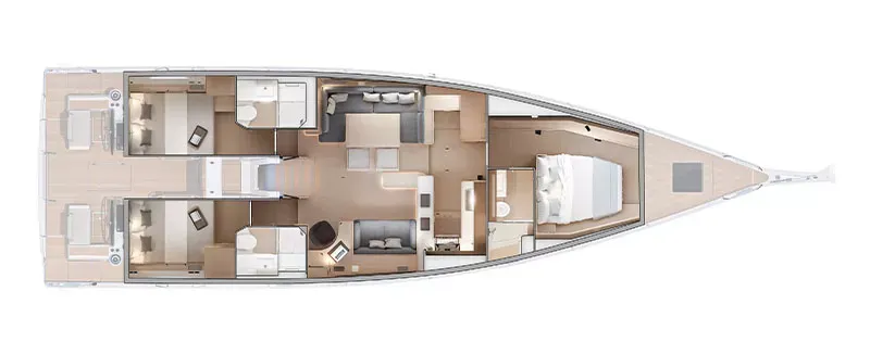 6명이 부드러운 소파가 있는 휴식 공간을 마주보며 테이블 주위에 앉을 수 있는 넓은 살롱. 곡선형 차트 테이블 덕분에 항해사는 선상의 모든 대화에 참여할 수 있습니다. 3개의 욕실이 있는 3캐빈 버전으로 제공되는 Oceanis Yacht 60은 두 가지 다른 마감재를 제공합니다: 기본 사양인 월넛과 옵션인 라이트 오크. 많은 성형 목재 요소들이 대형 래커 화이트 표면과 조화롭게 어우러지고 독점적인 실내장식과 매치됩니다. 이들이 함께 어우러져 확실히 세련된 분위기를 연출합니다.