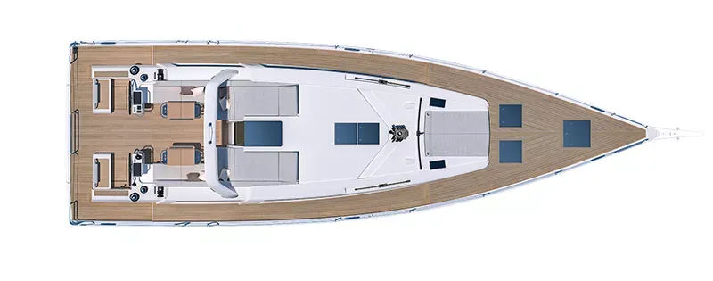 플러시 콕핏은 컴패니언웨이와 조타석 사이의 매끄러운 이동을 가능하게 하여 데크 위의 활동 구역과 휴식 구역 사이에 보이지 않는 경계를 만듭니다. 후방 수영 플랫폼으로 가는 동선과 통로를 따라 전방 데크로 이동하는 흐름은 매우 자연스럽고, 라인, 윈치 및 컨트롤의 배치는 거의 힘들이지 않고 세일링을 할 수 있게 합니다. 조타석에서 전방으로의 시야는 훌륭합니다. 콕핏 좌석은 편안하면서도 안락함을 느끼게 하지만, 전방 데크의 선패드가 보트에서 가장 인기 있는 장소가 될 것입니다.